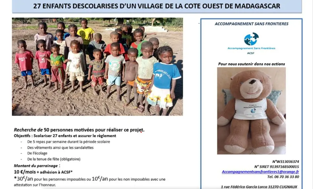 Notre équipe a rendu visite, comme chaque année, aux acteurs de nos projets sur place à Morandava et ses alentours pour s'immerger au sein des communautés et collaborer étroitement avec les personnes sur place que l'association aide et qui agisse pour améliorer le quotidien et la vie des villageois. Ces acteurs sont dirigeants et gérants du collège Saint Borromée et deux autres institutions religieuses et leurs oeuvres sociales envers des catégories socialement fragiles (personnes âgées etc). Nous avons pu voir la mise en oeuvre, dans le cadre du parrainage d'enfants non scolarisés autour du c... Lire la suite