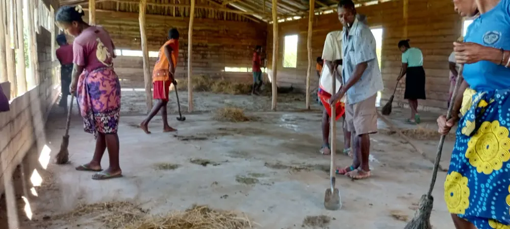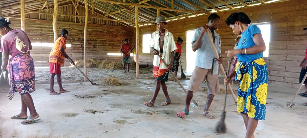 Nous voudrions rénover cet ancien bâtiment en bois pour créer la cantine scolaire (réfectoire, cuisine) + salle des professeurs/salle polyvalente: Les parents d'élèves ont nettoyé ce lieu pour permettre aux enfants parrainés de prendre leurs repas. Les enfants du village d'Ambalakapoaka ont intégré le collège en septembre 2024. Ils sont parrainés par l'association et peuvent bénéficier de repas. Deux mamans se relaient pour faire la cuisine.