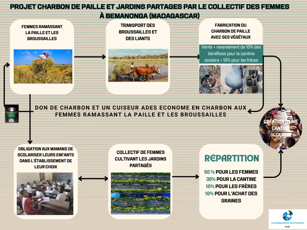 Les villageois ramassent et rapportent des broussailles à l'entrepôt équipé en machines qui emploiera 5 personnes en local sous l'égide d'un frère. Les villageois qui apporteront les broussailles recevront un foyer écologique (ADES) et du charbon de paille . La condition sera de scolariser leurs enfants (toutes écoles) dans le quartier de Bemanonga.